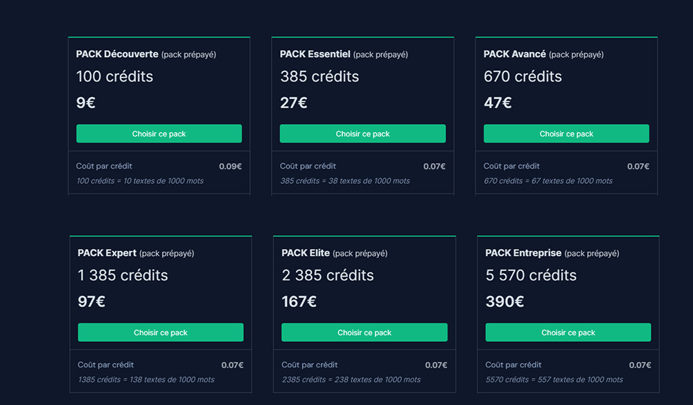 Le pack Expert à 97€, donne accès à 1385 crédits et donc 0,07€ l’unité. Il est possible ici de faire jusqu’à 138 analyses approfondies de textes de 1000 mots. C’est un bon choix pour ceux qui prévoient une utilisation intensive sur plusieurs mois.